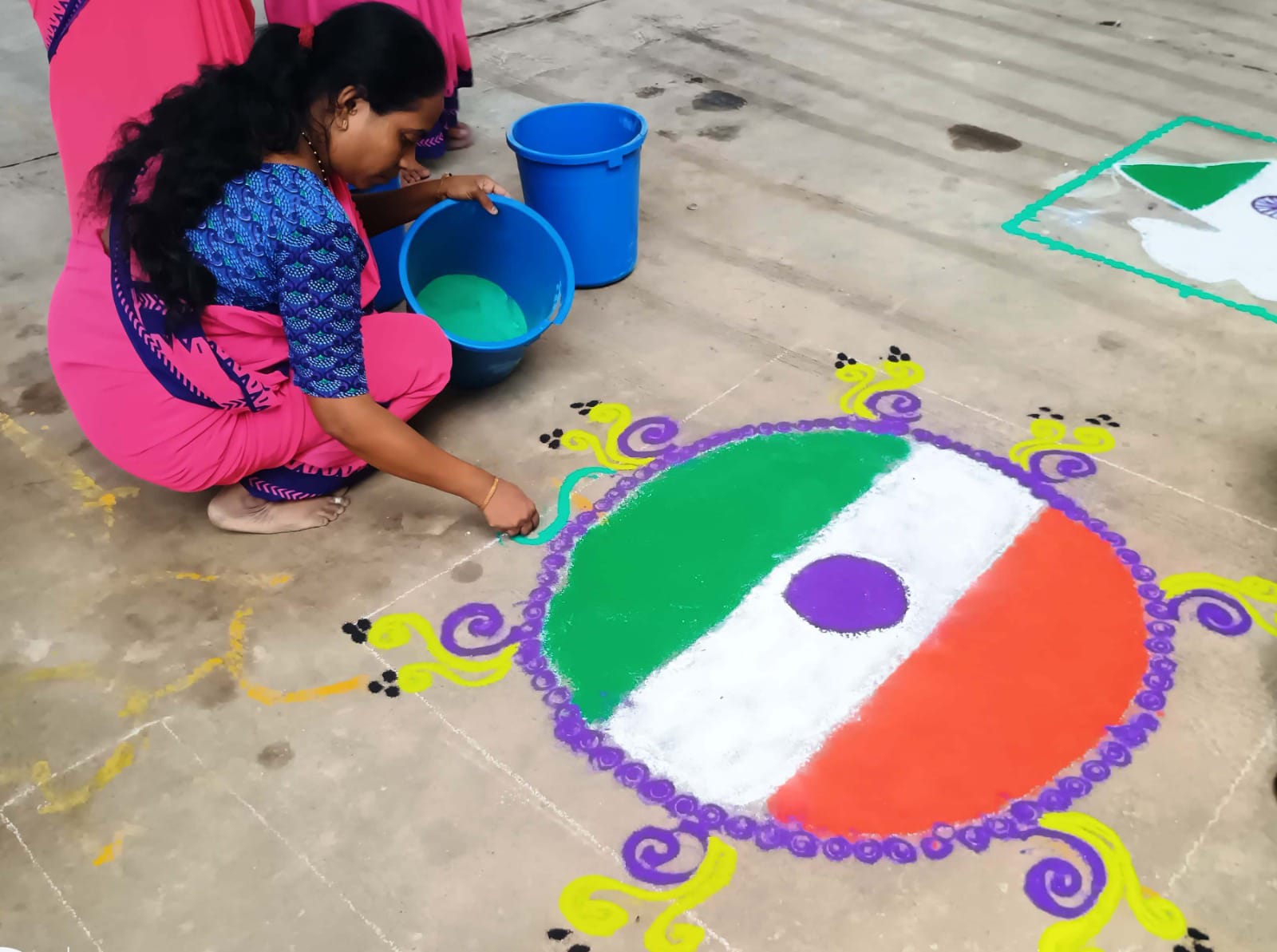 भोपाल। हर घर तिरंगा अभियान में प्रदेश के सभी जिलों में राष्ट्रध्वज के प्रति सम्मान और समर्पण के लिये जागरूकता कार्यक्रम आयोजित किए जा रहे हैं। बुरहानपुर जिले की शाहपुर नगर परिषद कार्यालय के प्रांगण में महिला बाल विकास विभाग की आंगनवाड़ी कार्यकर्ताओं द्वारा आकर्षक रंगोली बनाकर राष्ट्रध्वज के प्रति जागरूकता का संदेश दिया गया।