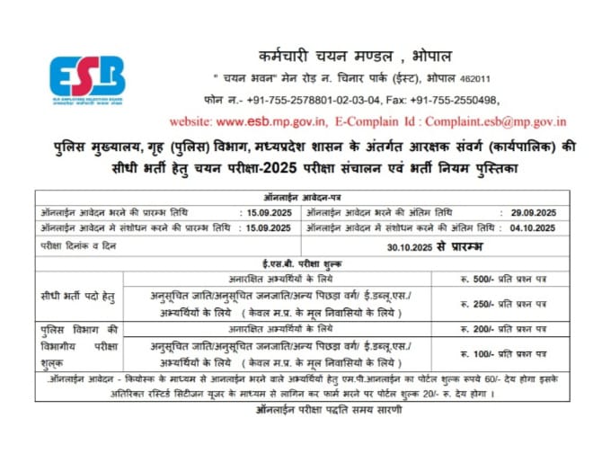 भोपाल/ ग्वालियर। एमपी पुलिस के लिए भर्ती की तैयारी में लगे बेरोजगार युवाओं के लिए गुड न्यूज़ है। बड़े इंतजार के बाद एमपी पुलिस कॉन्स्टेबल भर्ती के लिए ऑनलाइन आवेदन प्रक्रिया 15 सितंबर से शुरू हो चुकी है, जो निर्धारित अंतिम तिथि 29 सितंबर 2025 तक जारी रहेगी। जो अभ्यथी पुलिस कांस्टेबल भर्ती 2025 के लिए पात्र हैं वे ऑनलाइन वेबसाइट पर जाकर आवेदन कर सकते हैं।मध्य प्रदेश कर्मचारी चयन मंडल (MPESB) की ओर से पुलिस कॉन्स्टेबल के 7500 रिक्त पदों को भरने के लिए भर्ती निकाली गई है।