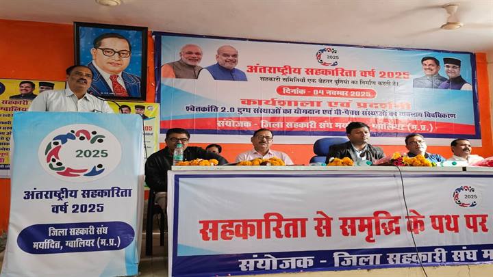 ग्वालियर। अंतर्राष्ट्रीय सहकारिता वर्ष के उपलक्ष्य में ग्वालियर जिले में भी कार्यक्रम आयोजित किए जा रहे हैं। इस कड़ी में मंगलवार को डबरा में “श्वेत क्रांति 2.0 में दुग्ध संस्थाओं का योगदान एवं पैक्स संस्थाओं का विविधीकरण” विषय पर कार्यशाला आयोजित की गई। इस कार्यशाला में नवीन दुग्ध समितियों के गठन के बारे में जानकारी दी गई। साथ ही प्रतिभागी किसानों व पशुपालकों को बताया गया कि किस प्रकार दुग्ध संस्थाओं से जुड़कर ग्रामीण अपने आप को आर्थिक रूप से सशक्त कर सकते हैं।