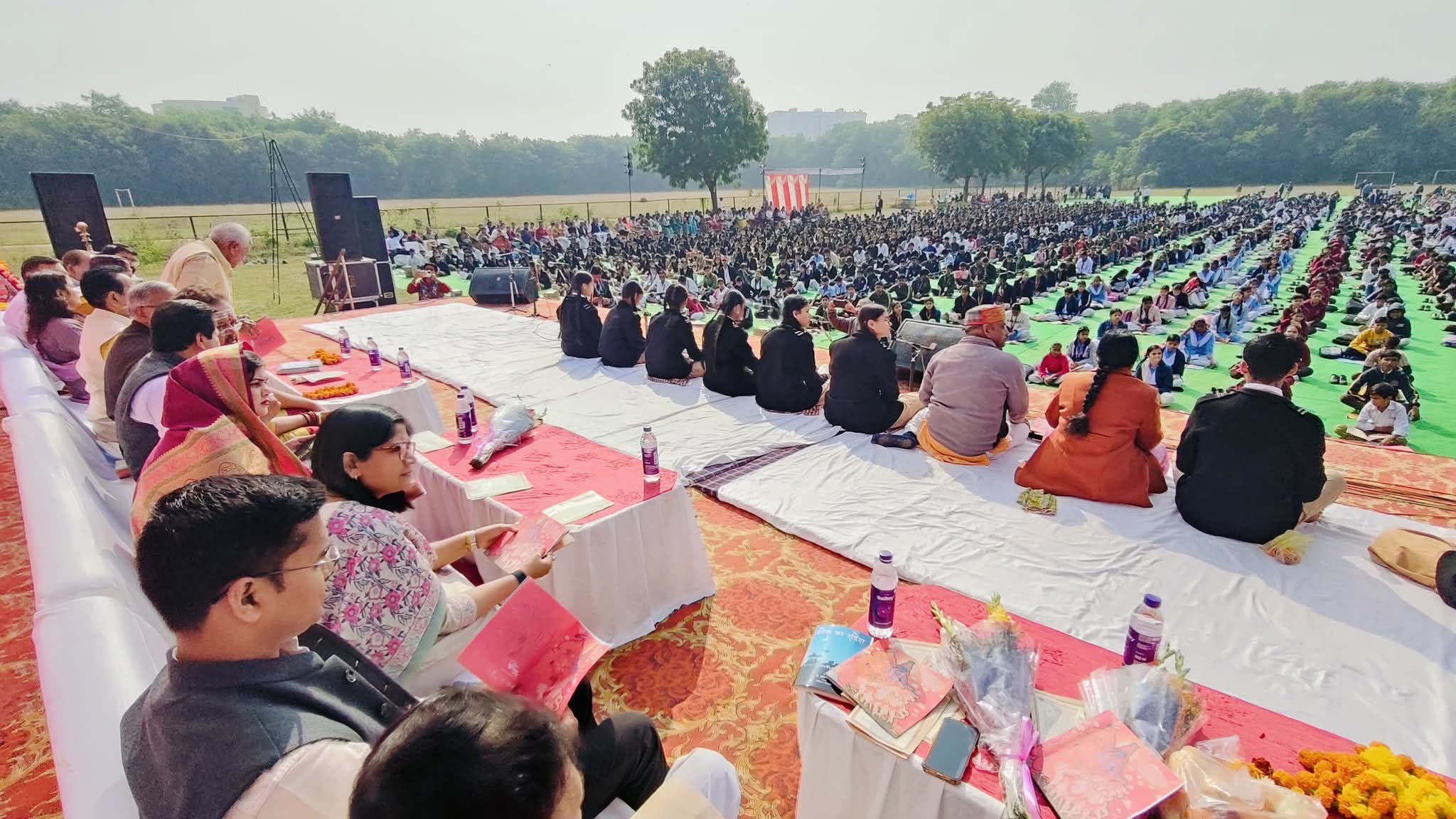गीता जयंती के अवसर पर जेयू के मैदान में श्रीमद् भगवत गीता के 15वें अध्याय के सामूहिक पाठ के अवसर पर इस सामूहिक पाठ में 6 हजार से अधिक विद्यार्थियों ने भाग लिया। श्रीमद् भगवत गीता के सभी मर्मज्ञों द्वारा गीता जी की महिमा बताई गई। इस अवसर पर भाजपा जिलाध्यक्ष श्री जयप्रकाश राजौरिया, घाटीगांव जनपद पंचायत उपाध्यक्ष सरला राठौर, जिला पंचायत उपाध्यक्ष प्रियंका सिंह घुरैया, कलेक्टर श्रीमती रूचिका चौहान, नगर निगम आयुक्त श्री संघ प्रिय, सीईओ जिला पंचायत श्री सोजान सिंह रावत, जीवाजी विश्वविद्यालय के कुलगुरू राजकुमार आचार्य, गीता प्रतिष्ठान से श्री विष्णु शर्मा उपस्थित रहे।रहे।