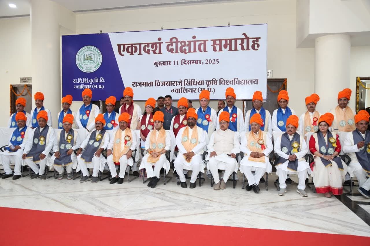 ग्वालियर। राजमाता विजयाराजे सिंधिया कृषि विश्वविद्यालय का 11वाँ दीक्षांत समारोह केन्द्रीय संचार एवं पूर्वोत्तर क्षेत्र विकास मंत्री ज्योतिरादित्य सिंधिया के मुख्य आतिथ्य में आयोजित हुआ। विश्वविद्यालय के दत्तोपंत ठेंगड़ी सभागार में आयोजित हुए दीक्षांत समारोह में उपाधियाँ प्राप्त करने आए कृषि विद्यार्थियों को संबोधित करते हुए सिंधिया ने कहा कि आज से आप सबका जिंदगी का नया अध्याय शुरू होने जा रहा है। विश्वविद्यालय में अर्जित ज्ञान, आत्मविश्वास एवं गुरुजनों द्वारा दिया गया मार्गदर्शन आप सबके सुखद भविष्य का निर्माण करेगा। उन्होंने विद्यार्थियों को सफल जीवन के तीन सूत्र बताए। श्री सिंधिया ने कहा कि कृषि विद्यार्थियों के लिये नवाचार, साझेदारी और किसानों के प्रति संवेदनशीलता सफलता के प्रमुख आधार हैं। केन्द्रीय मंत्री श्री सिंधिया ने उपाधियां प्राप्त करने वाले सभी विद्यार्थियों को उज्ज्वल भविष्य की शुभकामनाएँ दीं और कहा कि आप सब तकनीक व नवाचारों के जरिए राष्ट्र निर्माण के ध्वजवाहक बनकर उभरें।