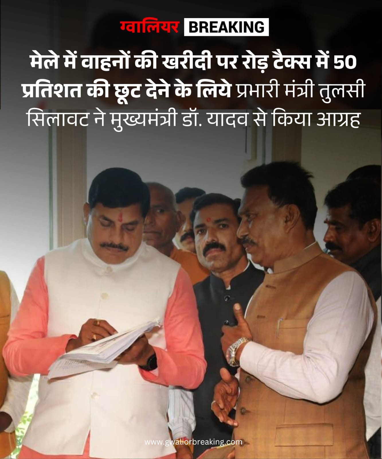 जिले के प्रभारी मंत्री तुलसीराम सिलावट ने मुख्यमंत्री डॉ. मोहन यादव से भेंट कर आग्रह किया है कि ग्वालियर के ऐतिहासिक व्यापार मेले में वाहनों पर 50 प्रतिशत छूट का निर्णय शीघ्र लिया जाए ताकि मेला अवधि में नागरिकों को इसका लाभ मिल सके। रोड टैक्स में छूट मिलने पर अधिक से अधिक वाहन कंपनियों को ग्वालियर में वाहनों के स्टॉल लगाने के लिये प्रोत्साहित किया जा सकेगा।