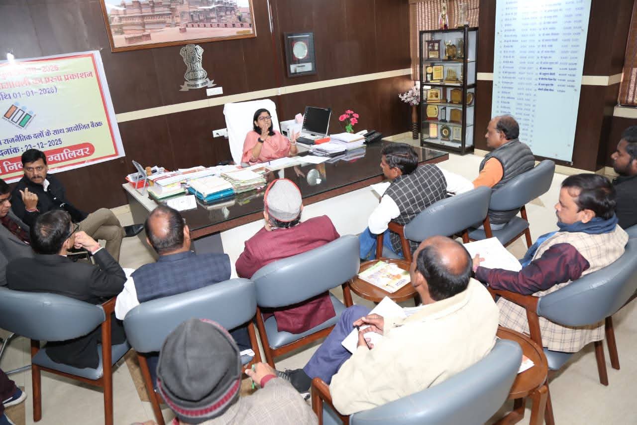 ग्वालियर। भारत निर्वाचन आयोग द्वारा जारी किए गए मतदाता सूचियों के विशेष गहन पुनरीक्षण (एसआईआर) के संशोधित कार्यक्रम के तहत ग्वालियर जिले के सभी 6 विधानसभा निर्वाचन क्षेत्रों के समस्त 1935 मतदान केन्द्रों पर मंगलवार 23 दिसम्बर को प्रारूप निर्वाचक नामावली का प्रकाशन किया गया। साथ ही कलेक्टर एवं जिला निर्वाचन अधिकारी रुचिका चौहान ने कलेक्ट्रेट में हुई बैठक में राष्ट्रीय मान्यता प्राप्त राजनैतिक दलों के प्रतिनिधियों को प्रारूप मतदाता सूची के बारे में विस्तारपूर्वक जानकारी दी । उन्होंने राजनैतिक दलों के प्रतिनिधियों को प्रारूप मतदाता सूची की फोटोयुक्त हार्डकॉपी व फोटो रहित सॉफ्टकॉपी एवं मतदान केन्द्रों की सूची भी सौंपी।