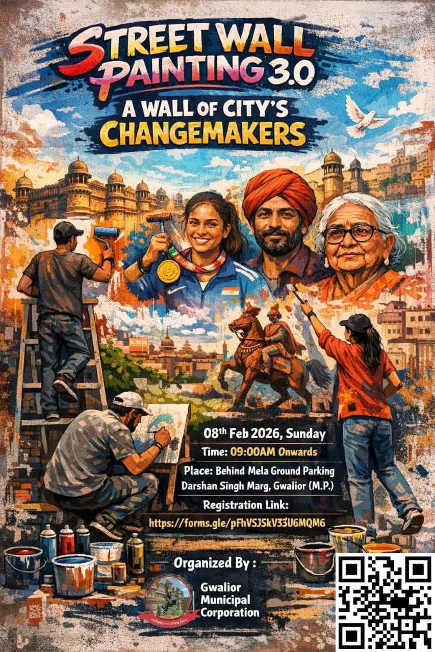 ग्वालियर। नगर निगम ग्वालियर द्वारा स्वच्छता के साथ शहर की सौंदर्यता के अंतर्गत आमजन जन-जागरूकता के दृष्टिकोण से ‘‘स्ट्रीट वॉल पेंटिंग’’ प्रतियोगिता का आयोजन 8 फरवरी रविवार को सुबह 9 बजे से मेला ग्राउंड के पीछे एडवोकेट दर्शन सिंह रोड पर निर्मित दीवार पर किया जा रहा हैं।
